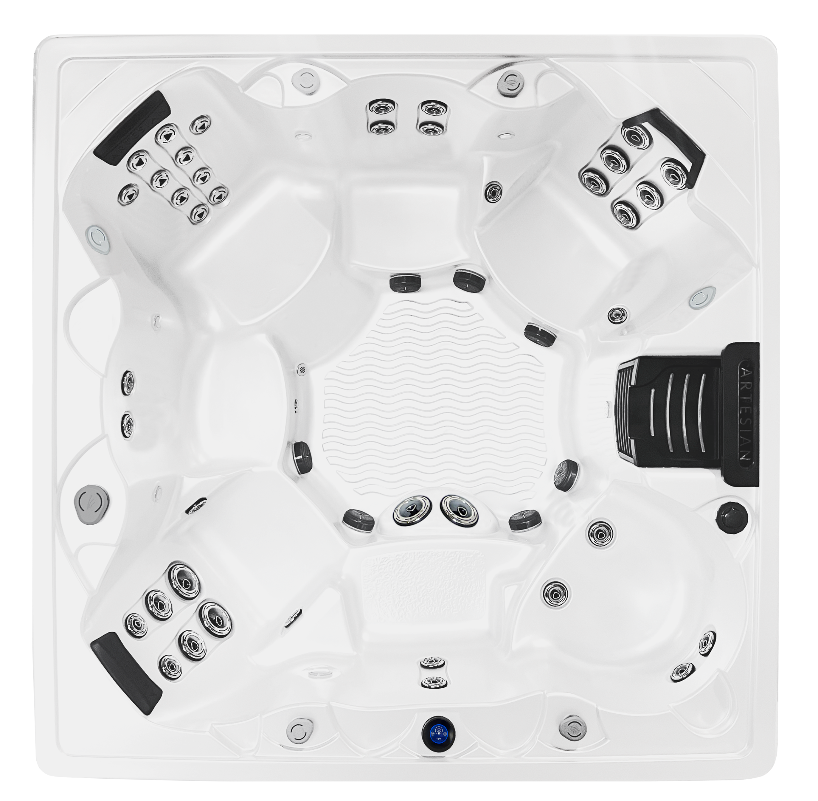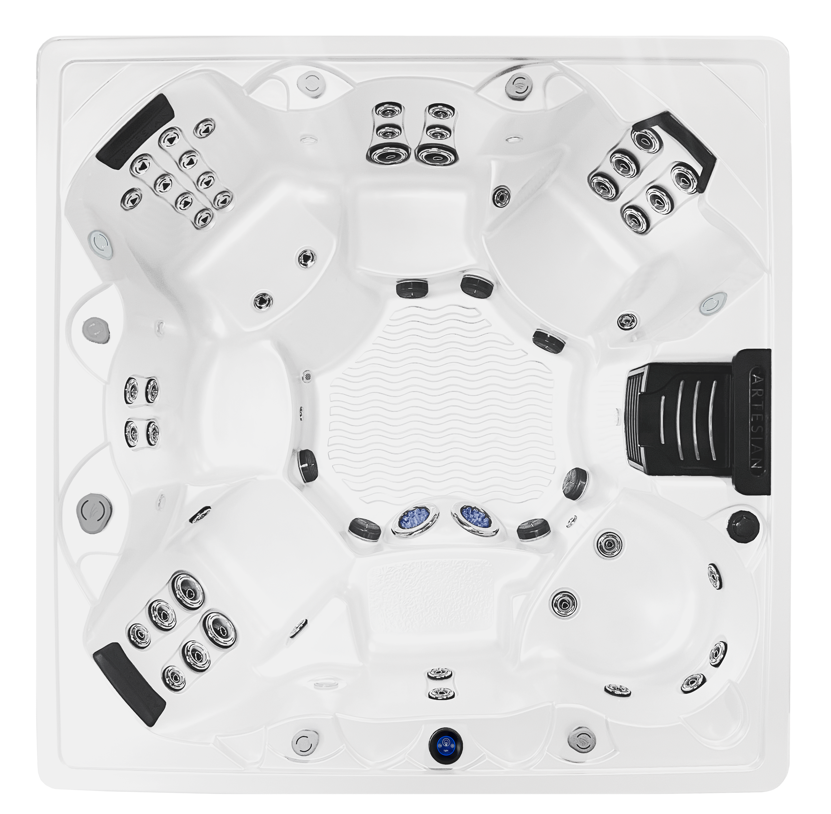 The Grand Cayman gives you plenty of reasons to relax alone or with friends and family. With multiple jet arrangements and open seating, this Island spa is designed for you and your guests to enjoy together. The two corner swivel seats allow users to elevate their feet and get not only a back massage, but side muscles and arms aswell.